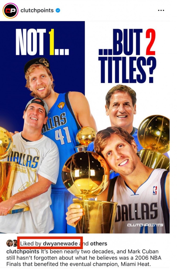 8月30日訊 近日美媒Clutchpoints在社媒發(fā)帖,談到了庫班之前的一個言論,他表示獨行俠隊06年的總冠軍是被“偷走”的。值得一提的是,該帖子被當年的FMVP韋德點贊。