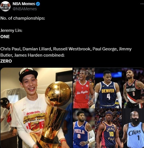“哈登、保羅、利拉德、威少、喬治和巴特勒加起來(lái)0冠,但林書(shū)豪有1冠?!盢BA Memes寫(xiě)道。