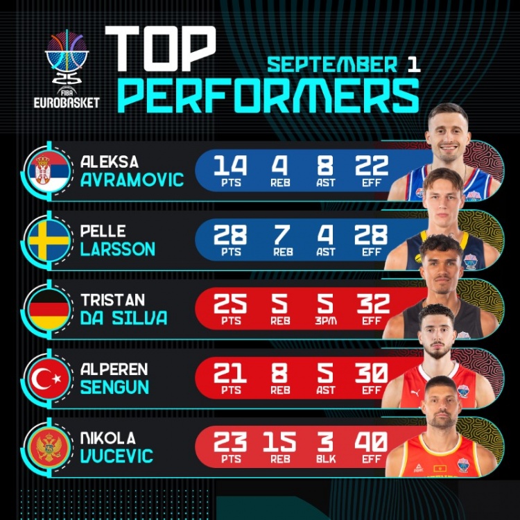 9月2日訊 男籃歐錦賽結束了又一個比賽日的爭奪,今天,歐錦賽官推曬出了昨日的球員高光表現(xiàn)。