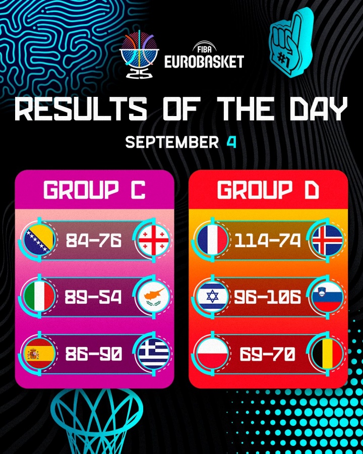 09月05日訊 男籃歐錦賽當地時間9月4日的6場小組賽全部結束,詳細賽果如下: