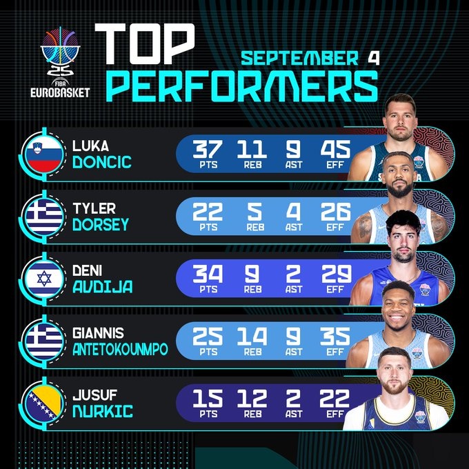歐錦賽官推曬昨日球員高光表現(xiàn):東契奇37分11板9助 阿夫迪亞34+9