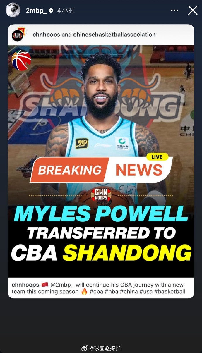@球圈趙探長 在個人微博上寫道:“鮑威爾已經(jīng)自宣加盟山東男籃,這位效力過青島男籃兩個賽季的外援,新賽季將重返CBA。