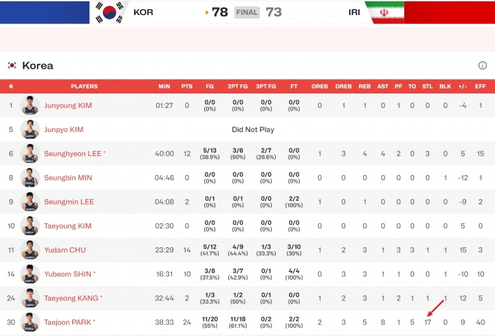 比賽最后時(shí)刻韓國(guó)U16領(lǐng)先3分,樸泰俊用第17個(gè)搶斷殺死比賽。單場(chǎng)17次搶斷也毫無(wú)疑問(wèn)地刷新了U16亞洲杯的賽會(huì)紀(jì)錄。