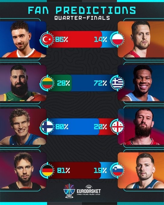歐錦賽官方發(fā)布1/4決賽球迷預(yù)測結(jié)果,具體如下:土耳其86% 波蘭14%立陶宛28% 希臘72%芬蘭80% 格魯吉亞20%德國81% 斯洛文尼亞19%...