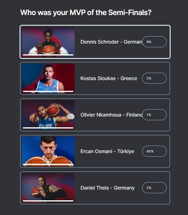 9月13日訊 男籃歐錦賽半決賽已落下帷幕,歐錦賽官方發(fā)起了半決賽MVP投票,截至目前,土耳其男籃球員奧斯馬尼以85%的票數(shù)斷檔領先。