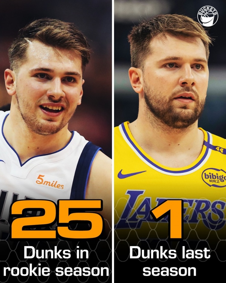 美媒曬圖統(tǒng)計(jì),東契奇新秀賽季扣籃25次,上賽季僅1次。