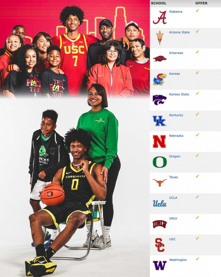 作為2026屆全美排名第24位的高中生,明年秋天才上大學(xué)的塔基已經(jīng)得到了眾多NCAA名校Offer,除了父親阿里扎的母校UCLA、還有南加大、肯塔基、堪薩斯等大學(xué)。