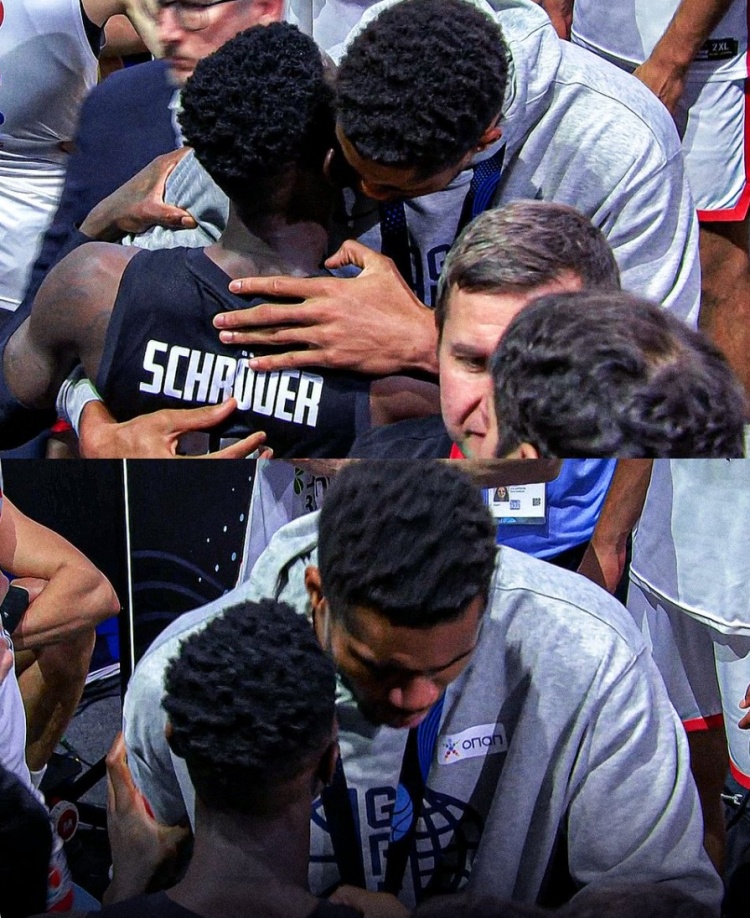 賽后,在場邊觀戰(zhàn)的字母哥和施羅德?lián)肀е乱狻?/p>