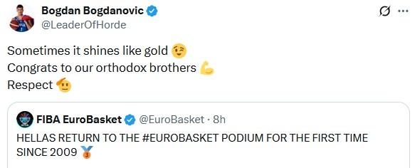9月15日訊 男籃歐錦賽季軍賽,希臘92-89戰(zhàn)勝芬蘭,奪得本屆歐錦賽季軍!快船球員博格丹-博格達(dá)諾維奇發(fā)推祝賀希臘隊(duì):“有時(shí)(銅牌)就像金牌一樣閃閃發(fā)光??“祝賀我們的正教(東正教)兄弟們??“值得尊重...
