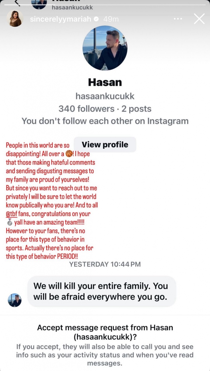 “這世界上的有些人真的讓人失望!就因?yàn)橐粓?chǎng)籃球比賽,那些向我的家人發(fā)送仇恨言論、發(fā)送惡心信息的人,希望你們好自為之!”