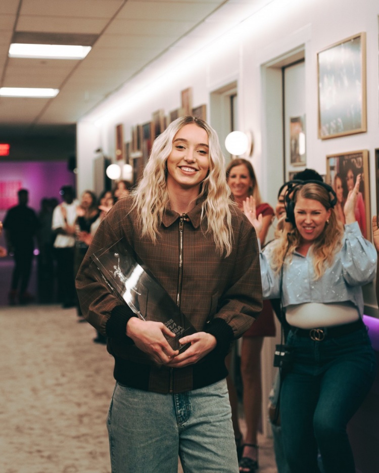 而在公布獲獎(jiǎng)的同時(shí),佩奇-布克斯也出現(xiàn)在了《The Jennifer Hudson Show》節(jié)目中,也在這從WNBA總裁凱茜-恩格波特手中接過(guò)了最佳新秀獎(jiǎng)杯。
