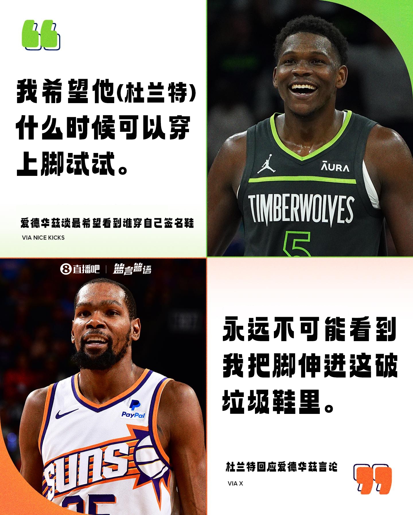2023年愛德華茲首次推出簽名鞋時,他說最希望杜蘭特穿自己的簽名鞋,但杜蘭特是NIKE旗下的球員,不可能穿競品的鞋子,當(dāng)時他在推特上直接回復(fù)道:“永遠(yuǎn)不可能看到我把腳伸進(jìn)這破垃圾鞋里(Mfers=mother f*ckers)!”還引發(fā)了一些爭議。