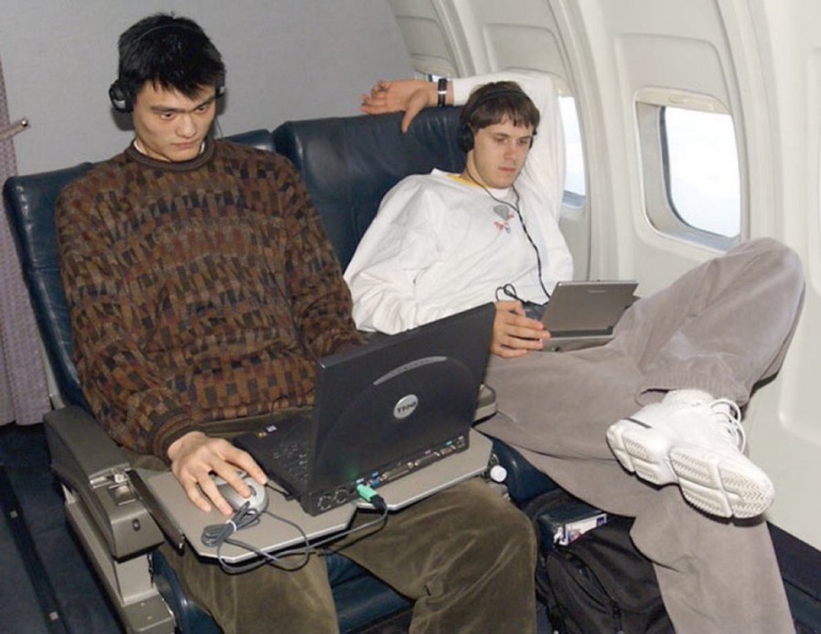 美媒寫道:2002年,姚明在球隊飛機上玩《過山車大亨》,而波斯簡-納赫巴在一旁看電影。