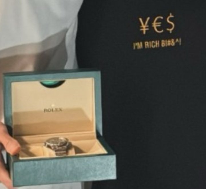 在兩人的合照中,申京衣服上印著三種貨幣符號,分別是日元/人民幣、歐元與美元,下方還寫著“我很富”的字樣。