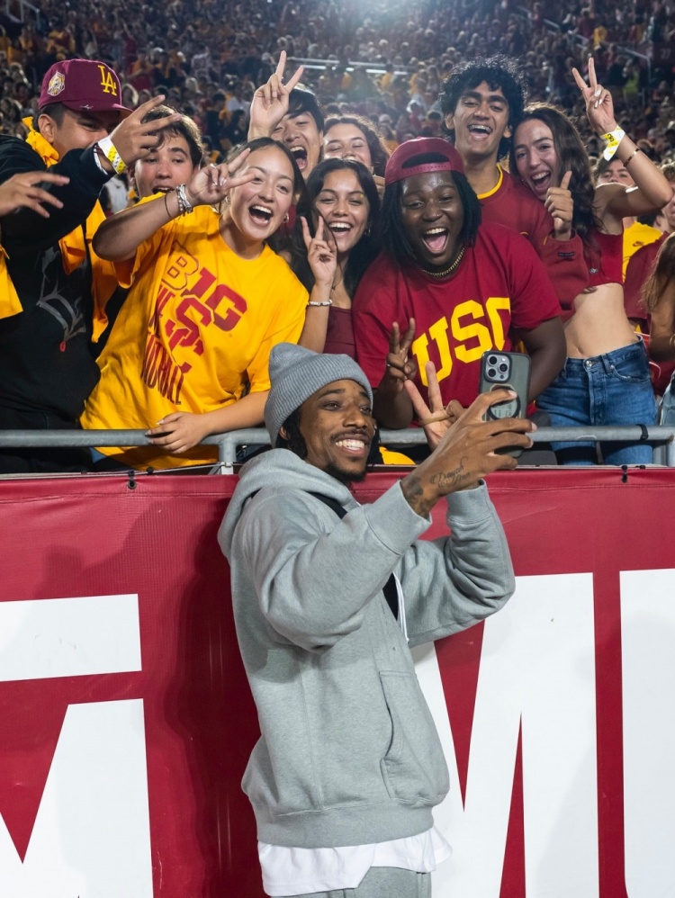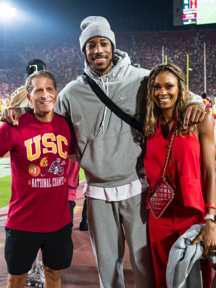 9月22日訊 南加大籃球隊(duì)社媒更新動態(tài),曬出了校友、NBA球員德羅贊回到母校觀看校橄欖球隊(duì)的比賽照片,德羅贊在現(xiàn)場也是熱情的和學(xué)弟、學(xué)妹們互動。