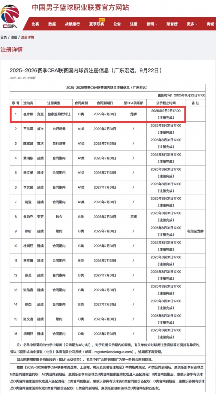 09月22日訊 今日,CBA官網(wǎng)更新了2025-2026賽季CBA聯(lián)賽國內(nèi)球員注冊信息。其中廣東宏遠(yuǎn)已成功為崔永熙完成注冊,并與其簽下四年B類合同,合同將于2029年7月31日到期。...