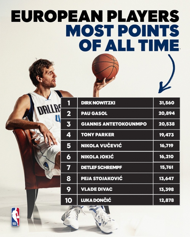 NBA歐洲官方賬號曬出歐洲球員得分前十,具體如下: