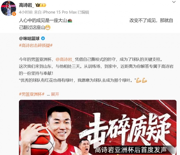 高詩巖轉(zhuǎn)發(fā)了該采訪,然后配文寫道:“人心中的成見是一座大山?? 改變不了成見,那就自己翻過這座山?!?/p>