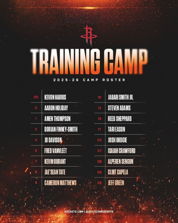 火箭公布訓(xùn)練營名單:杜蘭特&申京領(lǐng)銜 范弗里特在列 共18人