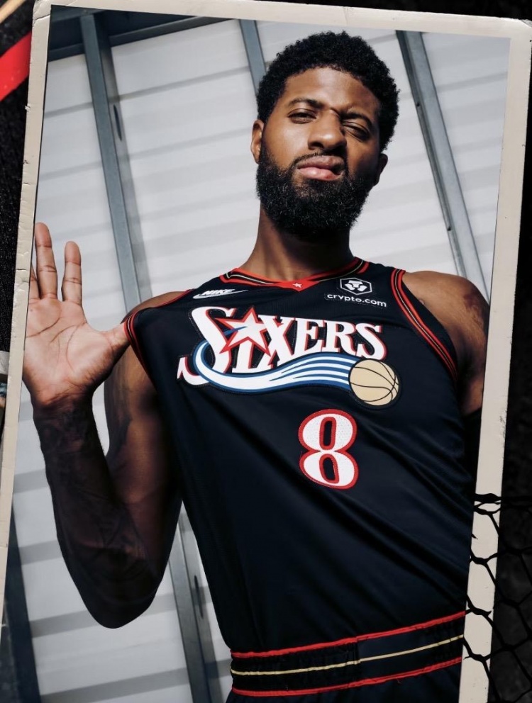 還挺帥!喬治中文社媒曬自己身穿76人經(jīng)典黑色球衣照:英雄歸來