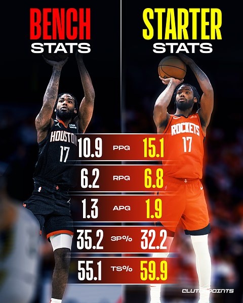 9月30日訊 美媒Clutchpoints曬出了火箭球員塔里-伊森上賽季打先發(fā)和打替補(bǔ)時(shí)的數(shù)據(jù)對(duì)比。