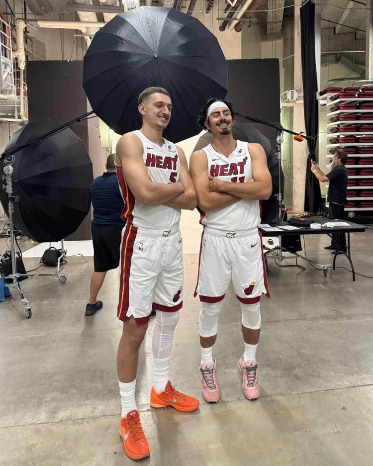 9月30日訊 熱火官方社媒曬出了媒體日上約維奇和哈克斯的合影。從照片中可以看到,哈克斯一直踮著腳,想要減少和約維奇的身高劣勢。