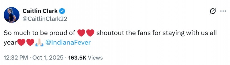 賽后,因傷賽季報(bào)銷的狂熱球星凱特琳-克拉克更推鼓勵(lì)球隊(duì),她寫道:“滿滿的驕傲 ???? 感謝球迷們一年來(lái)的陪伴與支持 ???????? @印第安納狂熱!”