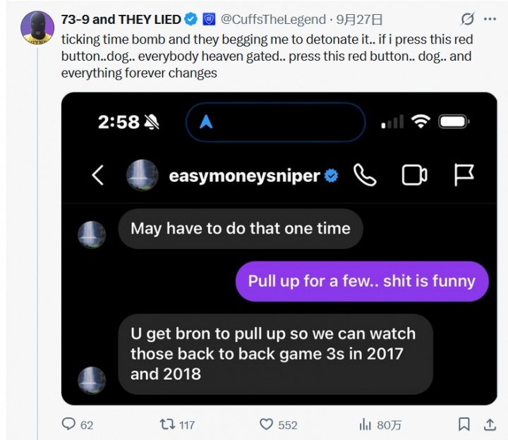 @CuffsTheLegend曝光了該條私信,并配文道:“定時(shí)炸彈,他們求著我引爆它...如果我按下這個(gè)紅色按鈕...每個(gè)人要上天堂...按下這個(gè)紅色按鈕...一切都永遠(yuǎn)改變了?!?/p>