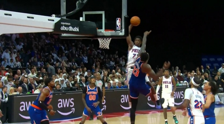 蹦得真高??76人探花埃奇庫姆起飛 隔扣米切羅沒成功但造成犯規(guī)