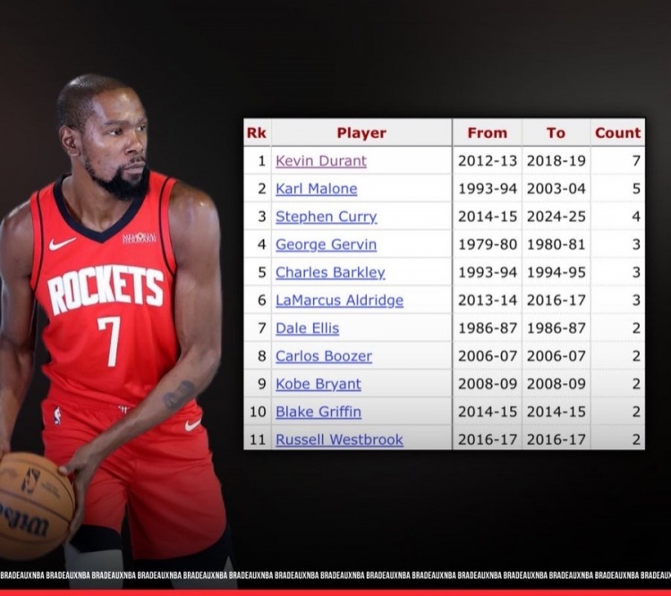??杜蘭特在休斯敦對陣火箭季后賽?共7次?砍下30+ 為歷史最多