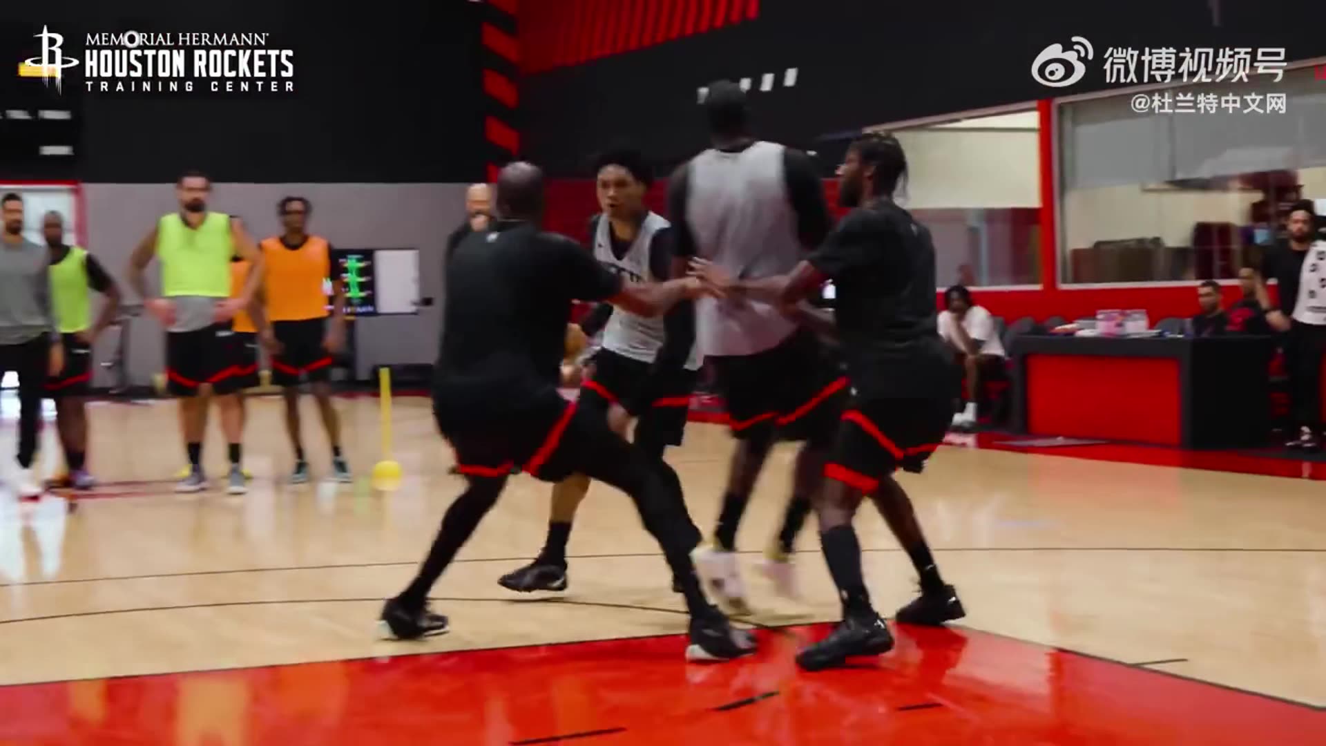富貴險(xiǎn)中求~火箭訓(xùn)練:阿門單打杜蘭特 面對(duì)長臂干擾單手打板命中