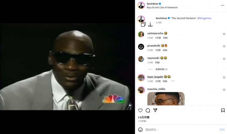 詹姆斯的好基友凱文-樂福更新IG曬出喬丹的演講視頻,并打趣詹姆斯:“決定二”。
