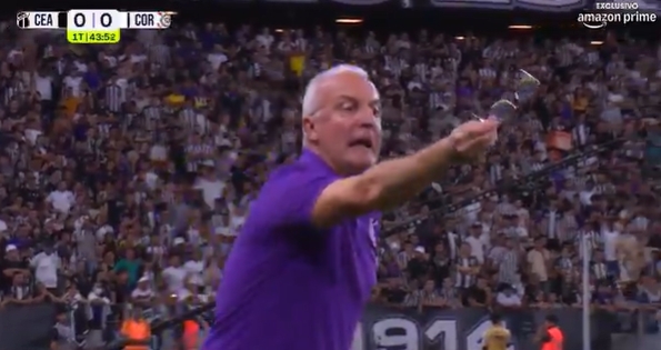 比賽上半場(chǎng)第43分鐘,科林蒂安球員接連倒地,裁判沒(méi)吹。隨后科林蒂安主帥多里瓦爾非常生氣,他摘下自己的眼鏡向第四官員示意,將眼鏡給主裁判。
