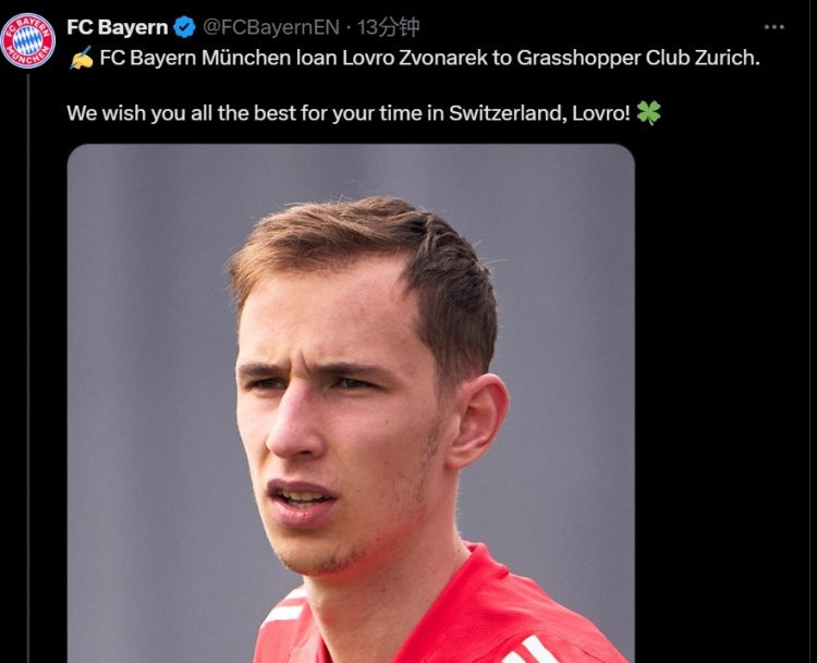 拜仁官方:外租20歲中場(chǎng)茲沃納雷到蘇黎世草蜢,租期一年