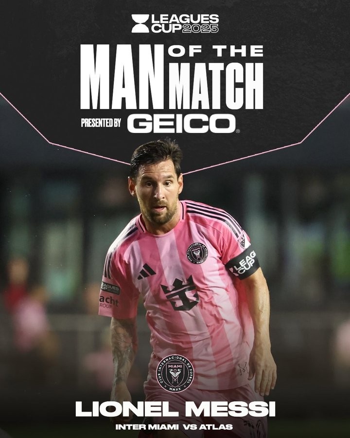 8月1日訊 官方消息,梅西當選邁阿密國際vs阿特拉斯的全場最佳。