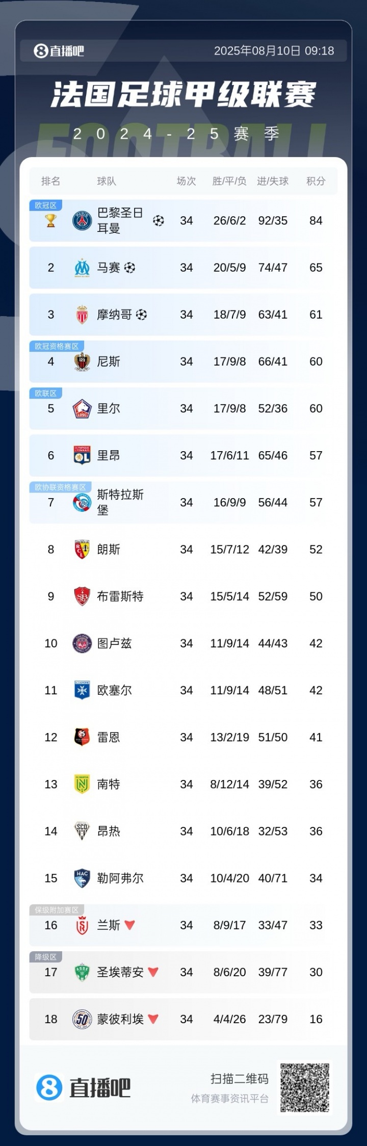 24/25賽季法甲積分榜回顧: