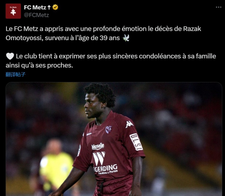 梅斯官方寫道:“俱樂部懷著深切的哀痛之情得知·奧莫托約西不幸去世,享年39歲。俱樂部向他的家人及親友致以最誠摯的慰問?!?/p>