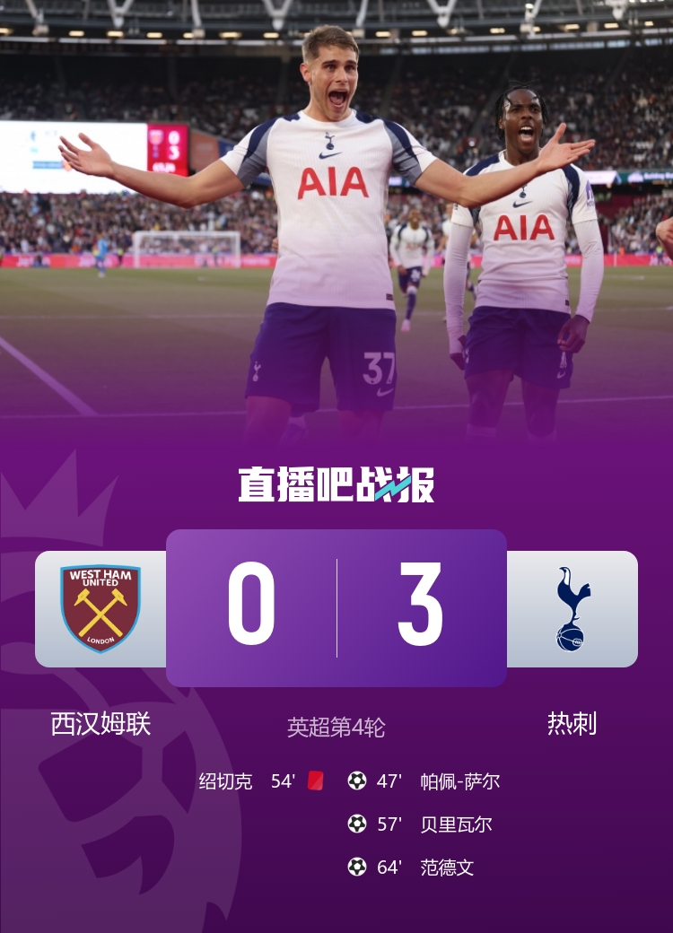 刷新紀(jì)錄!熱刺隊史首次在英超客場贏西漢姆聯(lián)至少3球