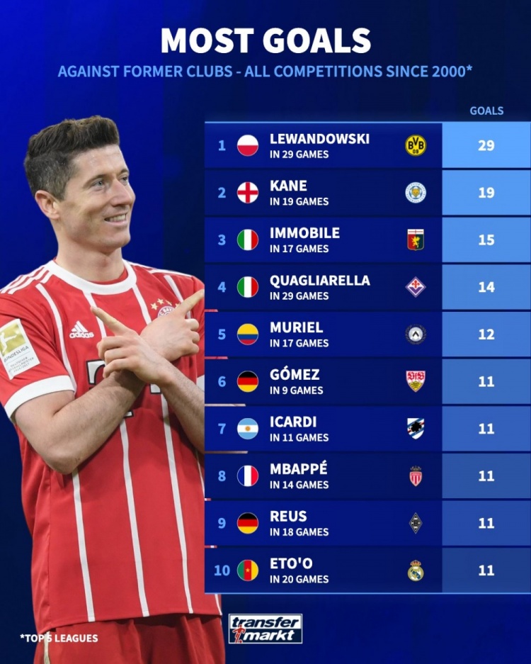 本世紀(jì)五大聯(lián)賽對(duì)老東家進(jìn)球榜:萊萬(wàn)29球居首,凱恩19球次席