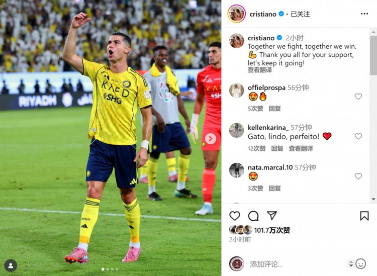 C羅社媒曬出賽后謝場(chǎng)的照片,配文:“我們一起戰(zhàn)斗,一起贏!感謝大家的支持,讓我們繼續(xù)贏下去!”