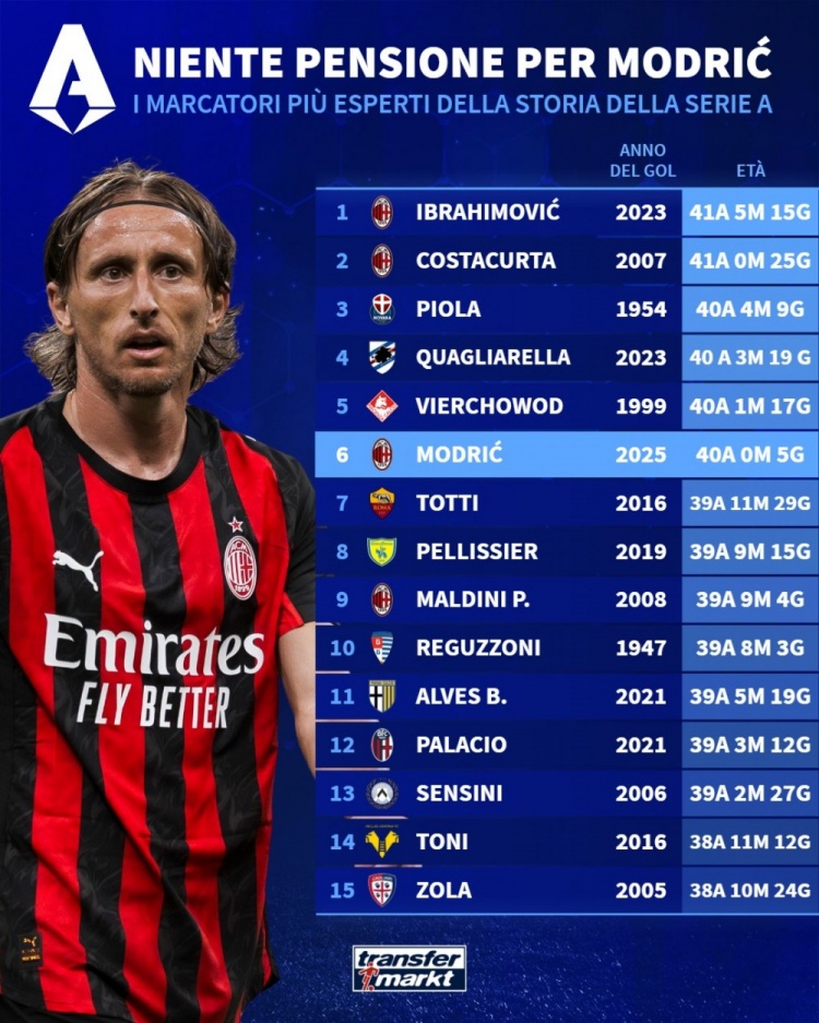 意甲年齡最大進球者排名:伊布、科斯塔庫塔前兩位,莫德里奇第六