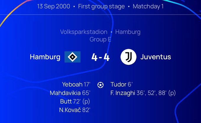 神巧合!尤文上次在歐冠4-4是00年踢漢堡,科瓦奇、圖多爾均破門(mén)