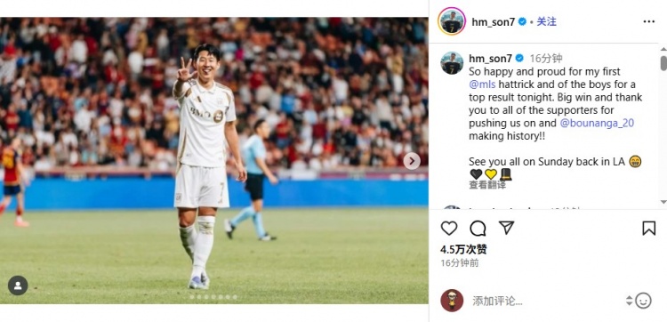 9月18日訊 孫興慜今天上演MLS生涯首次帽子戲法,幫助洛杉磯FC以4-1的比分戰(zhàn)勝皇家鹽湖城,賽后,這位韓國球星在Instagram曬圖慶祝。