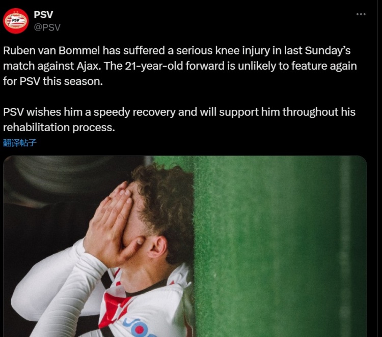 埃因霍溫寫道:“范博梅爾在上周日對(duì)陣阿賈克斯的比賽中遭遇嚴(yán)重的膝傷。這位21歲的前鋒本賽季不太可能再為俱樂(lè)部出場(chǎng)。”