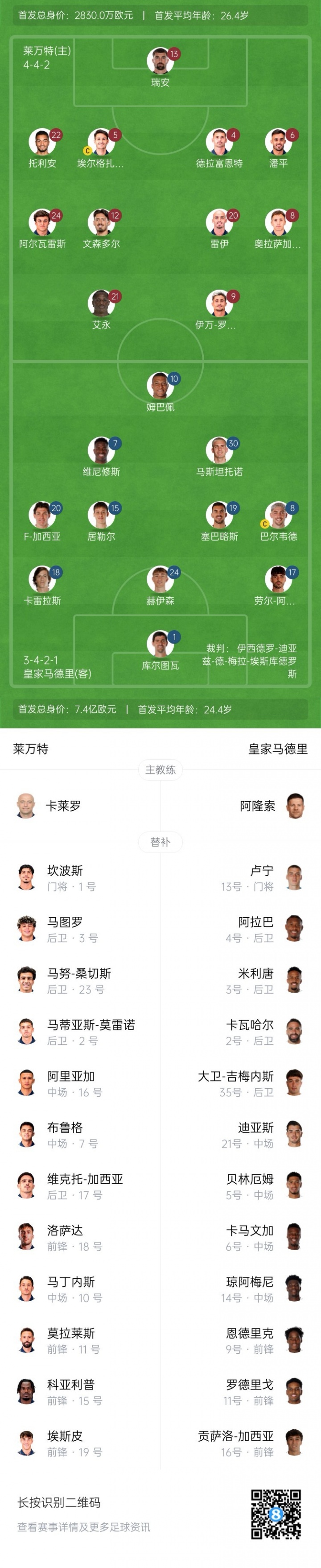 皇馬首發(fā):1-庫爾圖瓦、17-阿森西奧、24-赫伊森、18-卡雷拉斯、20-弗蘭-加西亞、8-巴爾韋德、19-塞巴略斯、15-居勒爾、30-馬斯坦托諾、7-維尼修斯、10-姆巴佩