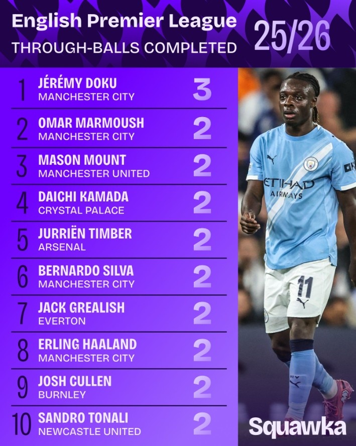 9月24日訊 本賽季英超戰(zhàn)罷5輪,“Squawka”統(tǒng)計(jì)了所有球員成功完成直塞次數(shù)的排名,曼城邊鋒多庫以3次領(lǐng)跑。