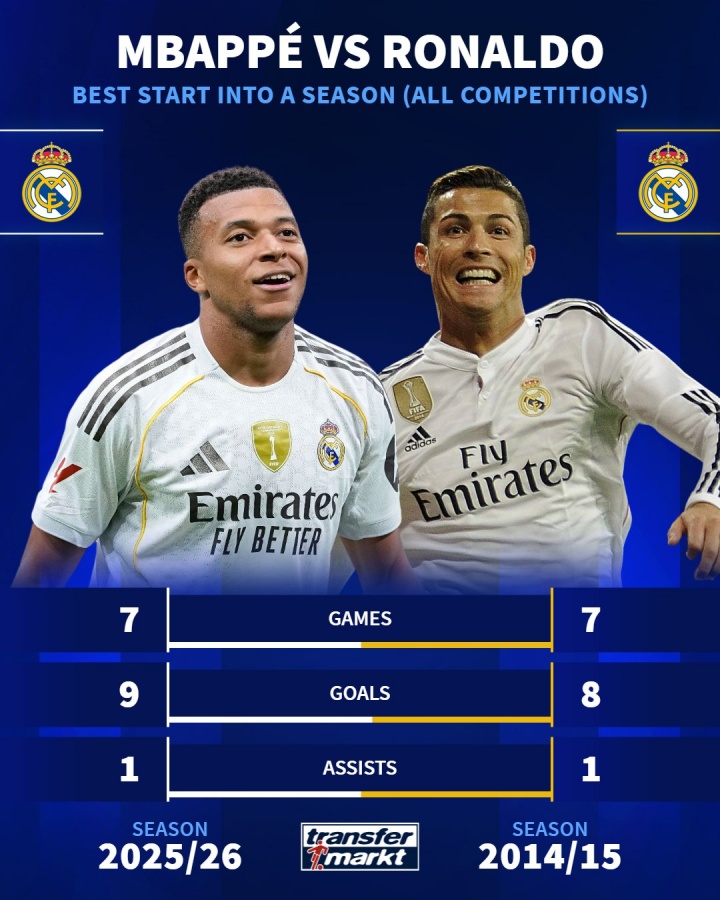 2025/26賽季,姆巴佩開局7場(chǎng)9球1助