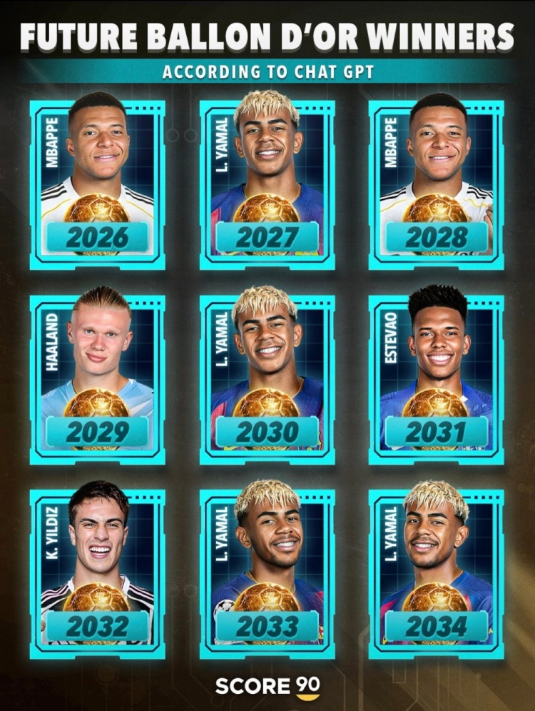 9月24日訊 Score90列出ChatGPT對未來幾年金球獎獲獎者名單,其中9年中亞馬爾占4席,具體如下:2026年:姆巴佩2027年:亞馬爾2028年:姆巴佩2029年:哈蘭德2030年:亞馬爾2...