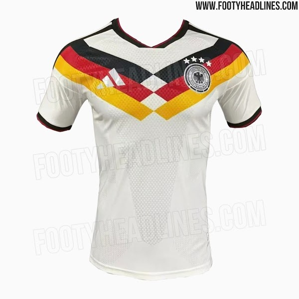 球衣主體為白色,并結(jié)合了德國國旗的黑、紅、黃三色。一個引人注目的三色V形設(shè)計從肩部一直延伸到胸前上方。