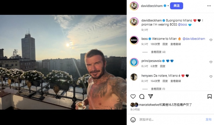 他還在社媒上發(fā)布了一張在酒店套房陽臺上赤裸上身的照片。這向米蘭、時裝周乃至英格蘭足壇都傳遞了一個明確的信息——貝克漢姆的影響力從未消退。